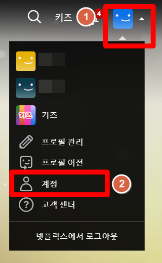 넷플릭스 사이트에 접속을 합니다. 초기 화면 오른쪽 맨 위에 있는 프로필을 선택하면 메뉴가 펼쳐집니다. 여기서 <계정>을 선택해 주세요.